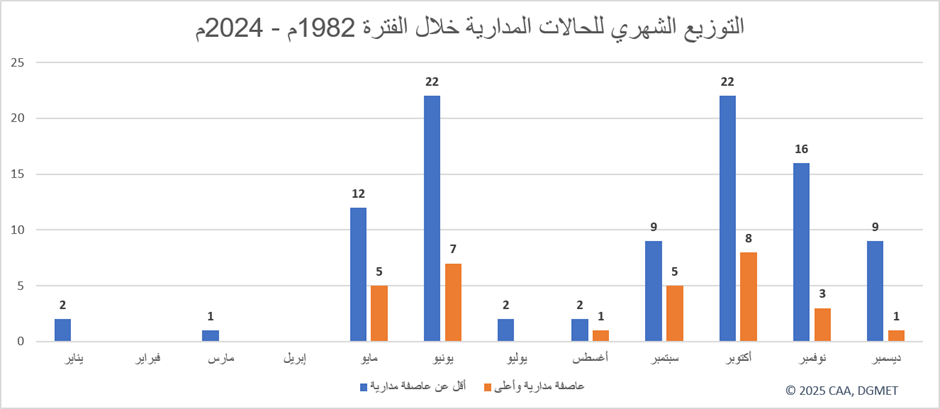 تزداد قوة وتكرار الأعاصير المدارية في بحر العرب خلال فترات ما قبل الرياح الموسمية (أبريل–يونيو) وما بعد الرياح الموسمية (أكتوبر–ديسمبر). ويساهم في زيادة شدة هذه الأعاصير ارتفاع درجات حرارة سطح البحر، إلى جانب تغير أنماط الرياح والرطوبة. ذروة تشكل معظم الأعاصير المدارية في هذه الفترات، على الرغم من إمكانية تكوّنها في بعض الأحيان خارج هذه الفترات، ولكنها غالبًا ما تكون أضعف.